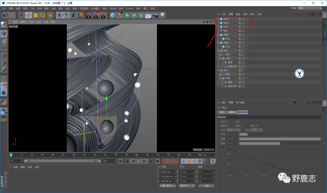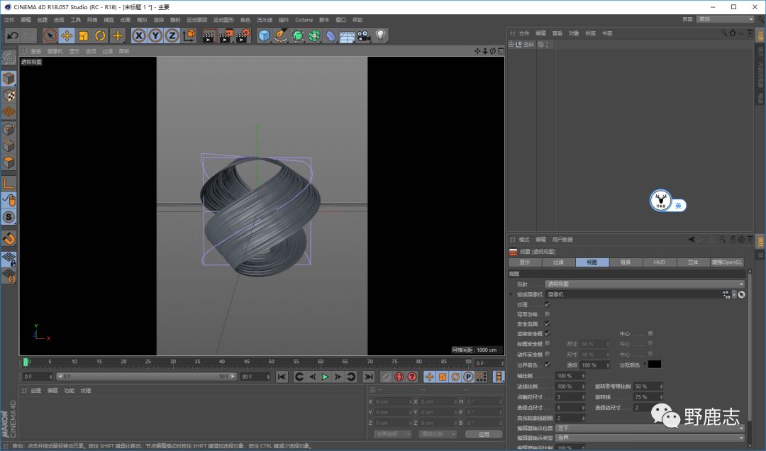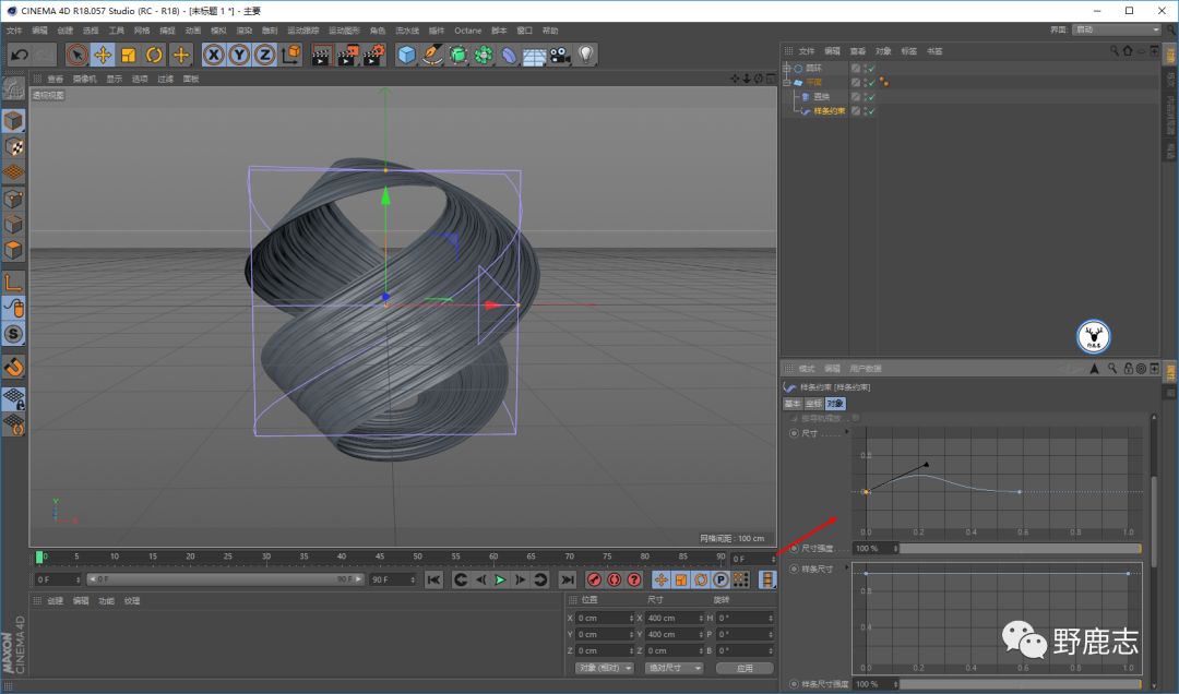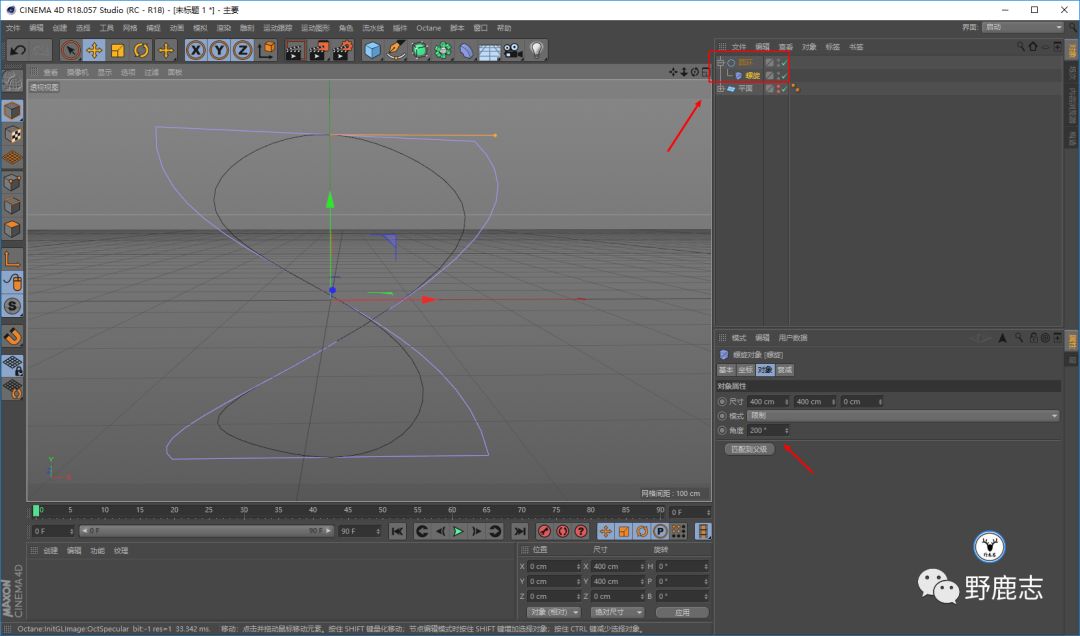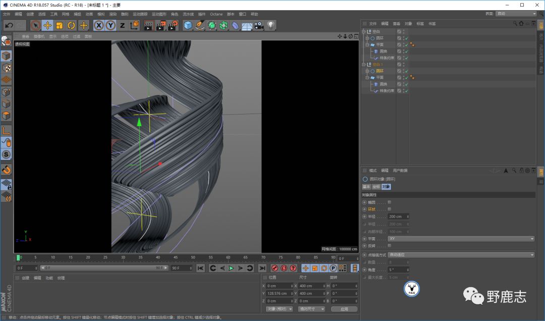 暂时隐藏掉平面,新建圆环样条线,再新建螺旋变形器,匹配到父级以后对样条线进行适当的扭曲旋转: