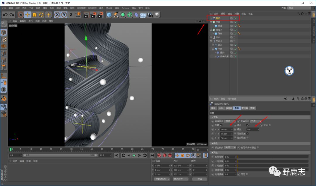 给两个克隆对象都添加一个随机效果器,随机它们的位置和缩放:
