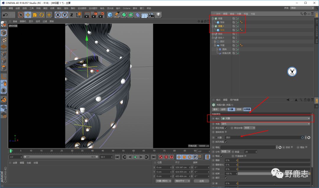 新建球体,新建克隆对象克隆球体,克隆模式为对象,然后分别以两个圆环来做为对象进行克隆: