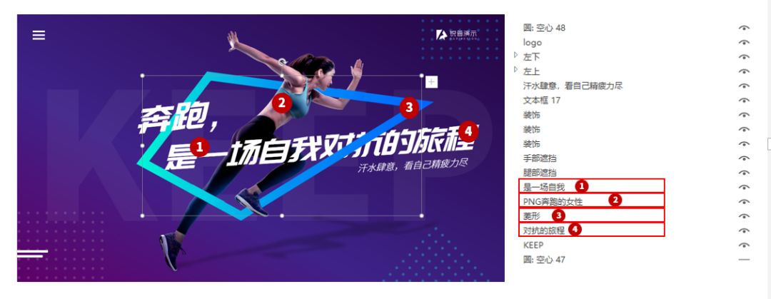 调整图层,把文字信息拆分之后,将“是一场自我”置于人物与菱形的上层,“对抗的旅程”置于菱形的下层,这样就有了明显的穿插效果。