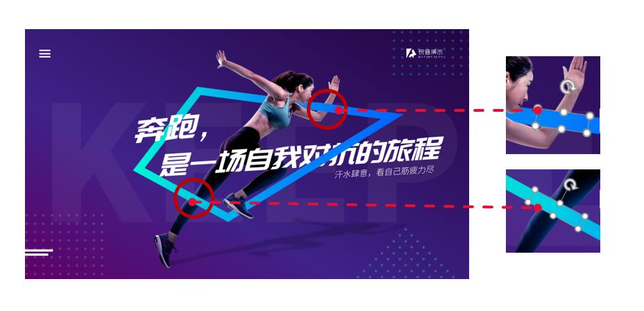为了让穿插更有张力,可以在手臂和小腿上增加一个与菱形块一致的形状遮盖(可以画个等宽的矩形,通过编辑顶点调整细节,且颜色与菱形保持一致)。