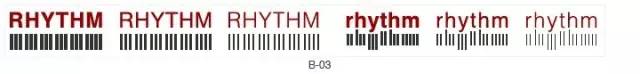 单行文字排版的横向韵律:根据字体的粗细设定节点的粗细和排布疏密,就能产生轻重缓急高低错落的节奏感和韵律感,如图(B-03)。