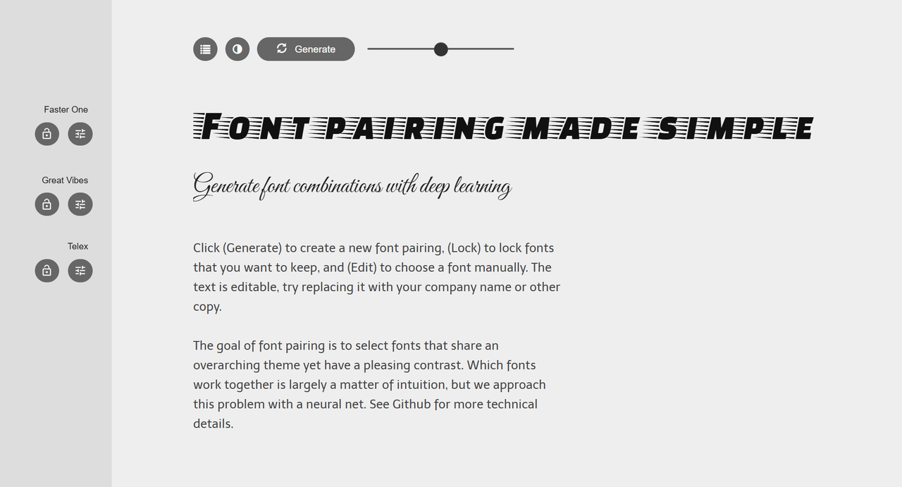 它的核心功能是利用机器学习算法,根据你选择的一个基础字体,智能推荐出与之搭配和谐的其他字体。这是它的核心卖点。你只需点击“Generate”按钮,它就会随机生成匹配的字体组合。它不仅仅是随机推荐,而是基于对字体美学和排版原则的深刻理解来给出建议。例如,它可能会推荐一个粗衬线体作为标题,搭配一个纤细的无衬线体作为正文,以达到视觉上的平衡和信息层级的分明。