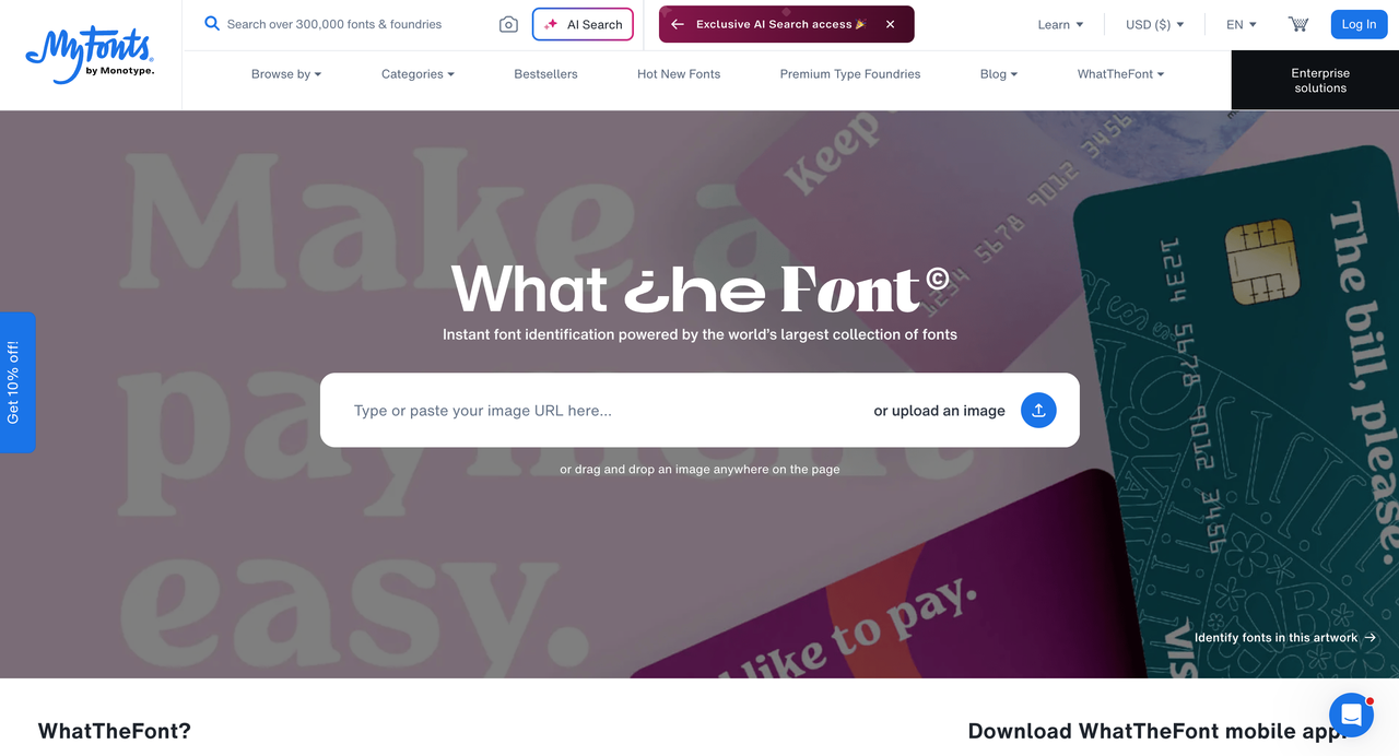 基础功能完全免费,但推荐字体很多来自 MyFonts,需要付费购买。也就是说,它更像一个“找字体入口”,而不是完整解决方案。