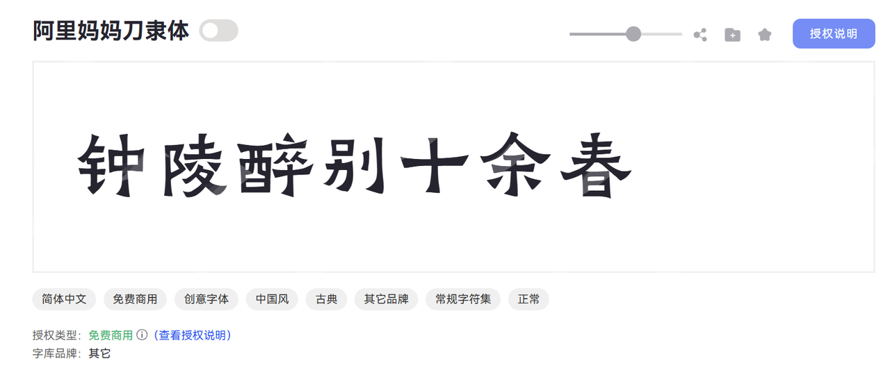 阿里妈妈刀隶体是一款极具个性的复古隶书字体,打造出兼具传统韵味和现代设计感的字体,在字由网的复古风格创作中十分热门,满足日常复古场景创作需求。