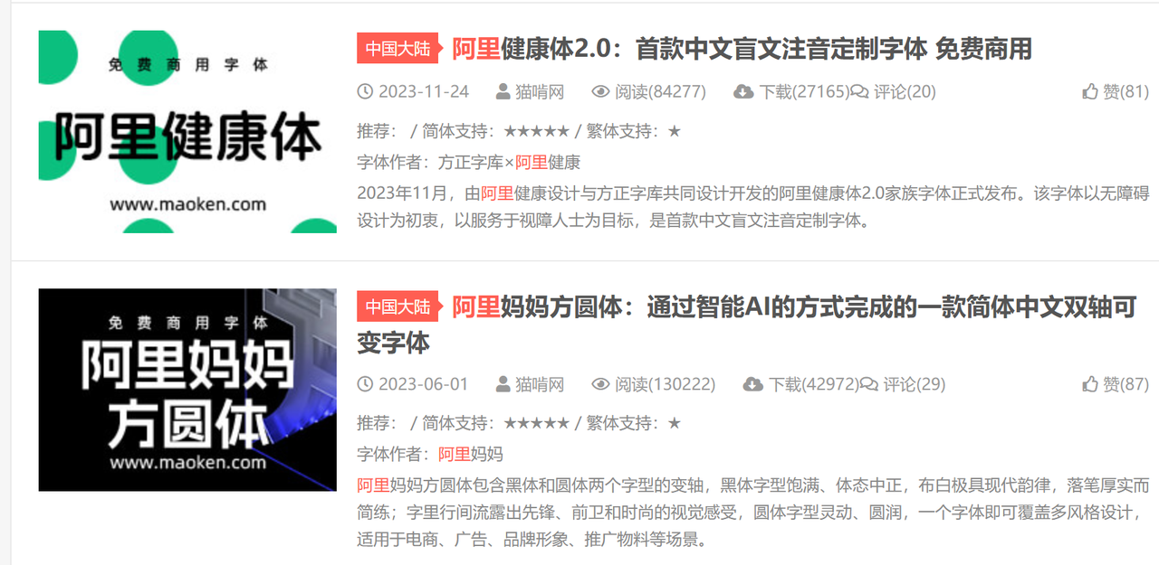 虽非阿里直接运营,但猫啃网早已与字由网达成深度合作,成为阿里系免费字体的重要收录平台。它以严苛的版权核验标准闻名,收录的上千款阿里系字体都标注清晰授权信息,还支持在线开具授权证书,客户索要版权证明时直接下载即可。网站分类极细,手写体、艺术体、书法体等一应俱全,想找小众有设计感的阿里系字体,来这里准没错。