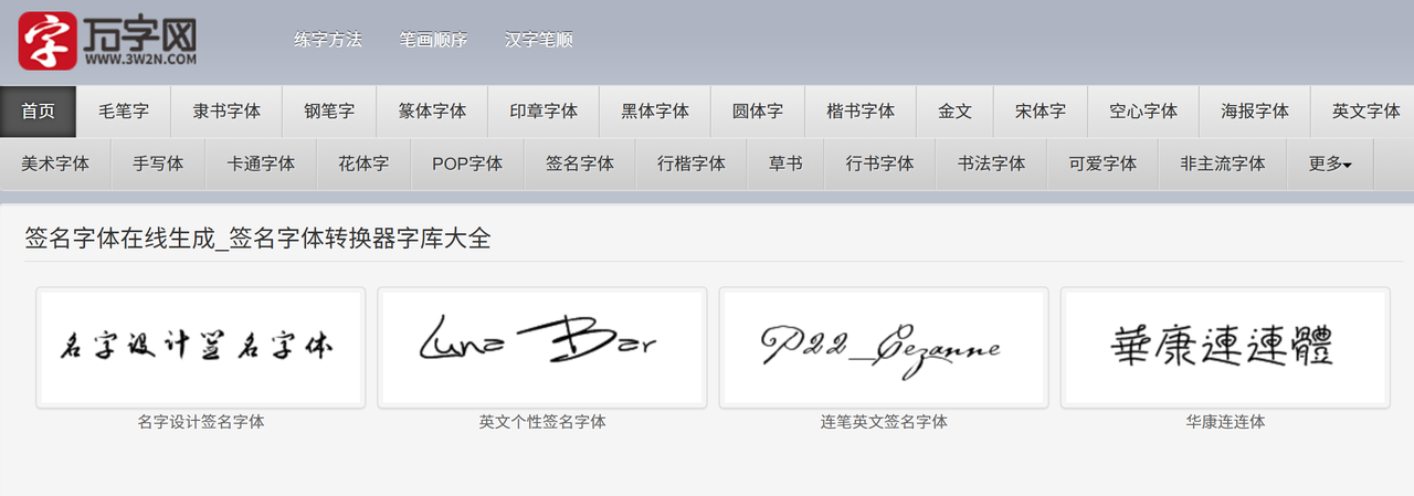 万字网是一款主打书法风格的宝藏工具,兼顾艺术字体生成与书法学习功能,堪称“在线书法字典+签名神器”,尤其适合偏爱毛笔风、楷书风签名的用户。万字网有专门的签名字体,无论是中文签名还是英文签名,这里都有。操作流程简洁不繁琐:进入官网后直接定位“签名字体”专区,输入姓名后,可选择字体大小和颜色,点击在线转换就可以得到你的姓名艺术签名。