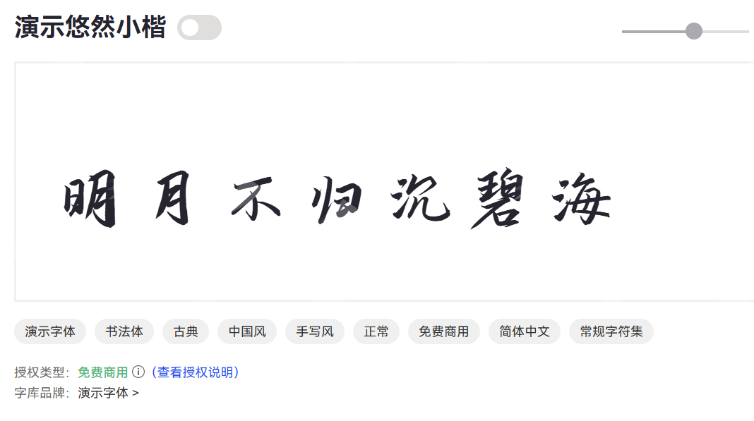 演示悠然小楷线条细腻,笔势自然,具有很强的传统书法艺术感。适合古籍排版、文档书写、文化类出版物及艺术设计。所以使用它能够提升文本的文化品味与艺术感染力。