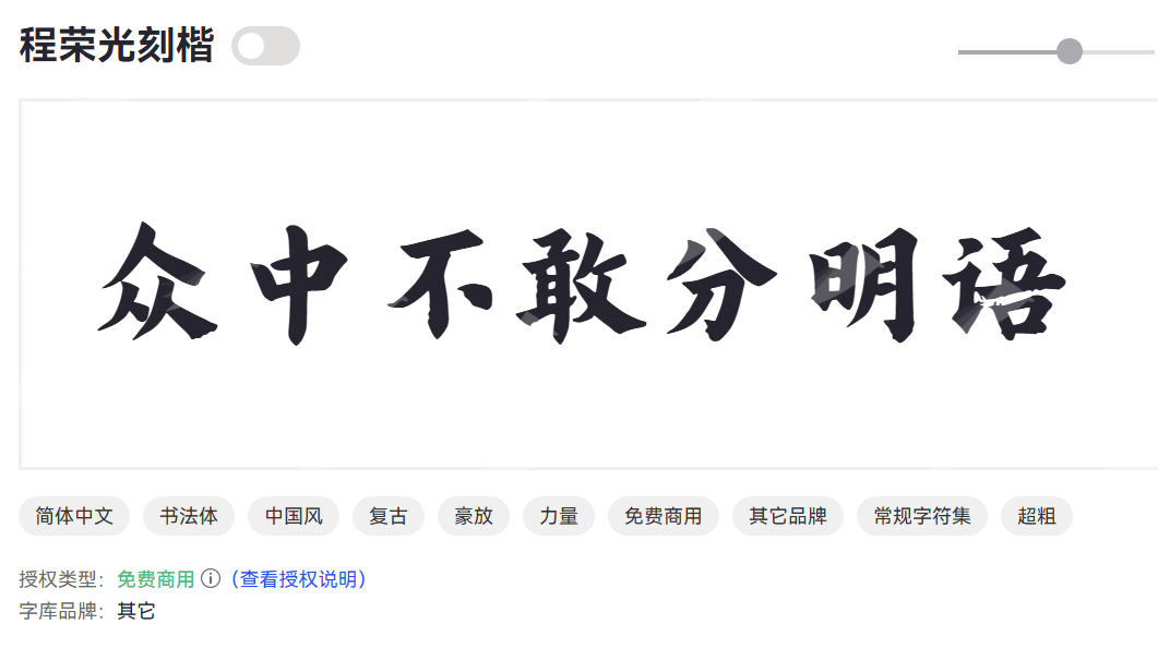 程荣光刻楷是一款严谨规整的刻楷字体,笔画刚劲有力,结构端正清晰,兼具楷书的规范性与刻字的雕刻质感。字体庄重稳健,适合正式文稿与刻字应用。