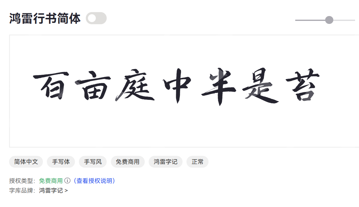 鸿雷行书简体是一款具有强大视觉冲击力的毛笔字体,笔画如鸿雷般磅礴、有力,线条流畅而充满力量感,常用于需要突出气势和力量的标题设计。