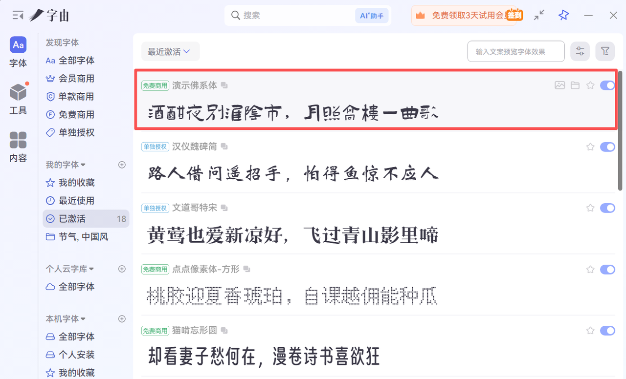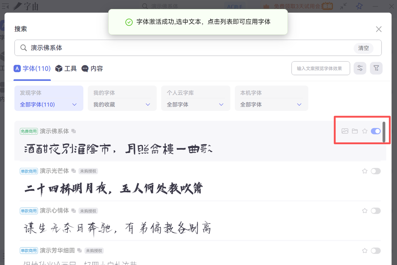 在字由客户端中搜索上述毛笔字体,比如:演示佛系体,点击右侧【激活】按钮即可