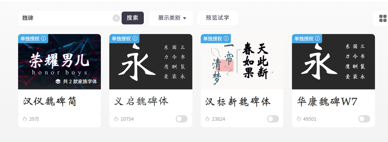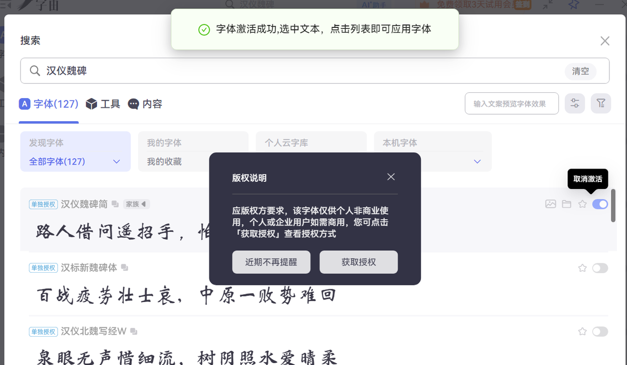 以“汉仪魏碑”为例,我们只需要打开字由客户端,搜索汉仪魏碑,点击右侧的激活即可。(需要注意,如果商用使用需要获取授权)