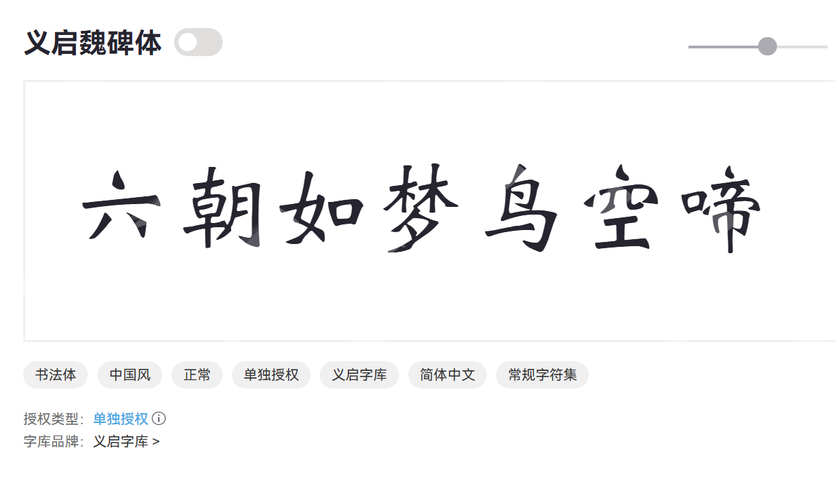 义启魏碑体基于魏碑书法创作,强调个性化和视觉冲击力。字体设计旨在平衡传统美学与现代应用,为用户提供多样化选择。