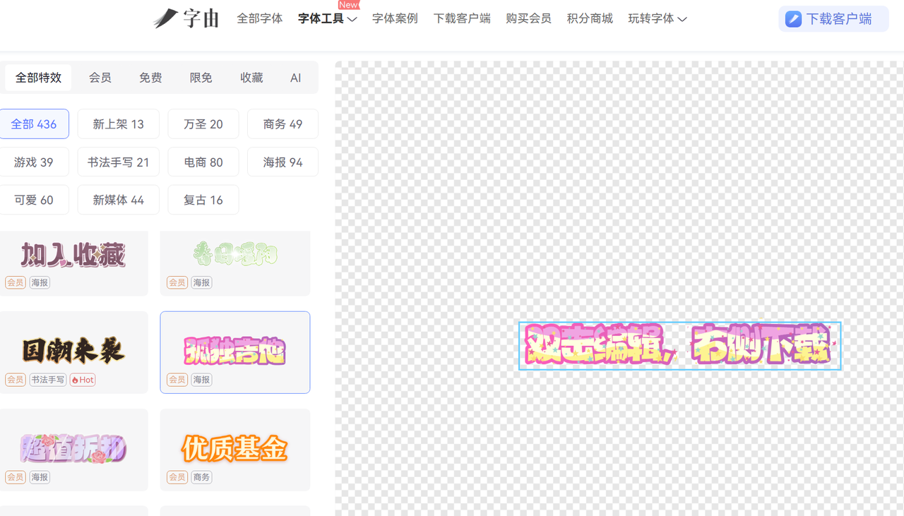 除此之外,字由网还有400+款字体特效,尤其是近期上新的款式,贴合当下热门设计风格,可自定义内容并导出使用,不用额外用设计软件调整,省时又省力。