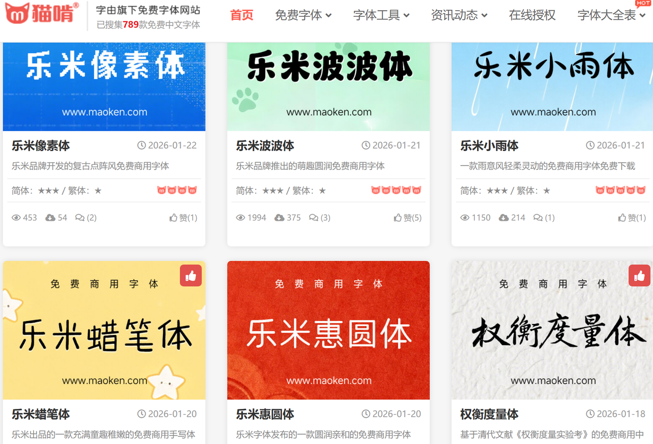 目前猫啃网已有近千款优质中文免费商用字体,更新频率很高,经常能找到新款小众字体,它的字体更聚焦中文场景,无论是楷书、行书、草书等传统书法体,还是简约无衬线体、可爱卡通体、复古印刷体等创意字体,都能满足日常个人使用和小型商业设计需求。网站的分类也很清晰,按字体风格、使用场景、字体作者进行细分,比如想找适合手写笔记的字体,直接点击“手写体”分类就能筛选,不用在海量字体中盲目翻找。
