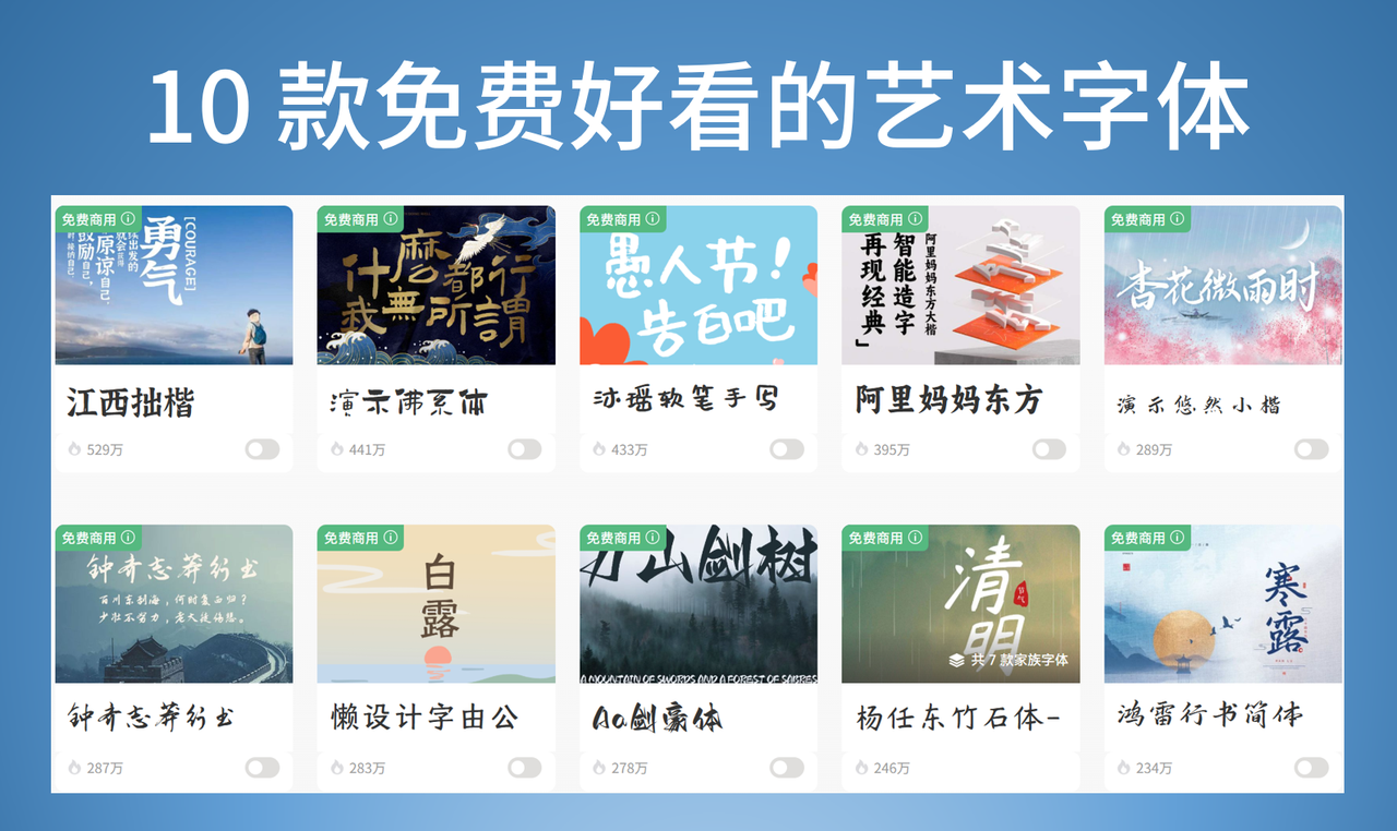 以上 10 款免费好看的艺术字体,大家都可以在字由平台中找到,如果想要获取更多免费好看的艺术字体,大家可以下载字由客户端,通过客户端可以查看更多的艺术字体,同时不用下载安装,在线就能一键使用艺术字体,非常高效方便。