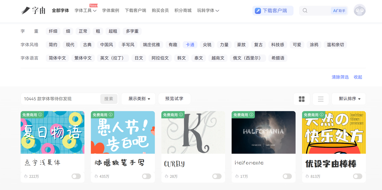 各位设计师朋友如果想要找到更多的卡通字体,可以打开字由官网,字体风格选择【卡通】,就可以筛选出更多的卡通字体。