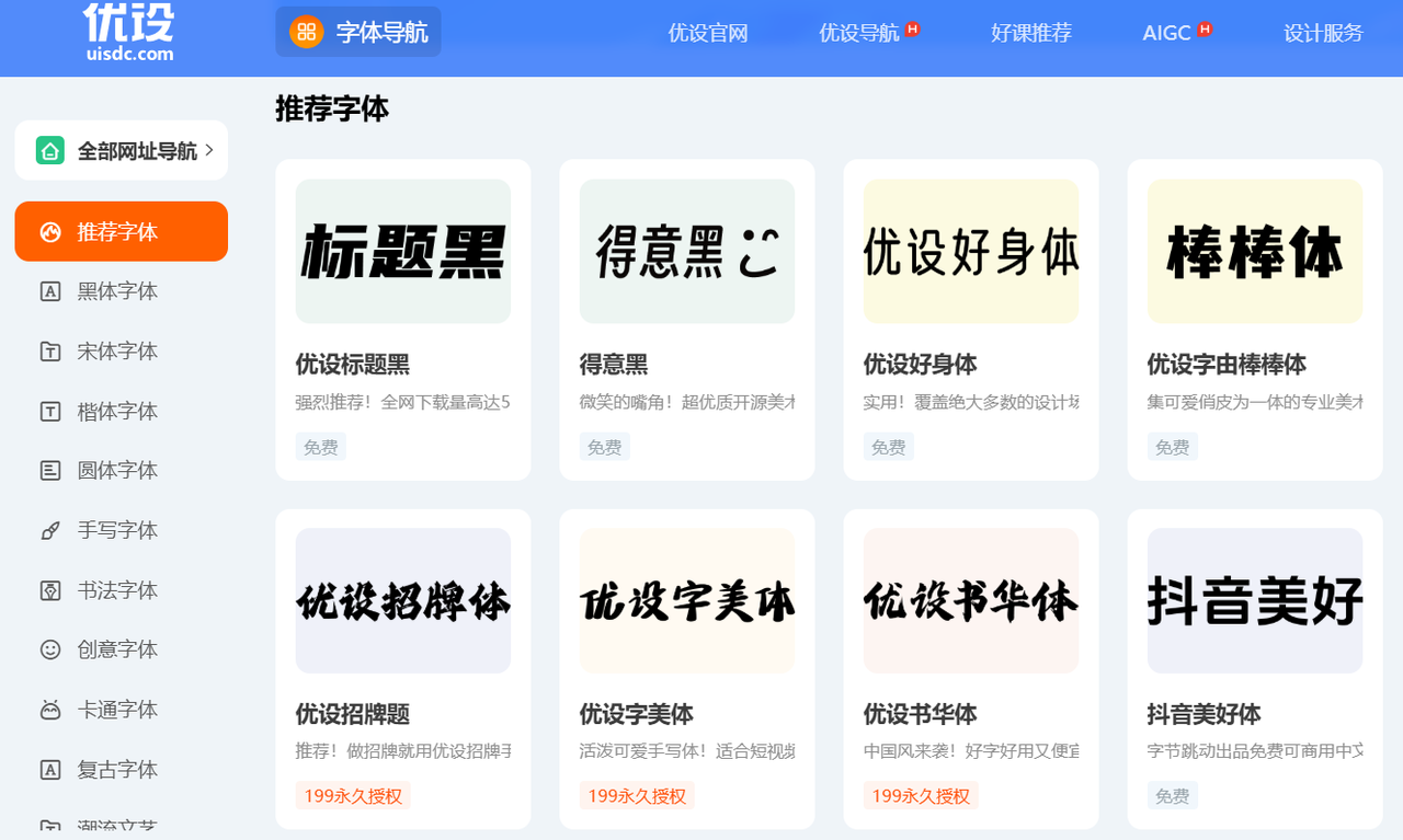 但其实优设也是一个好用的素材网站,就比如优设字体导航,它是优设旗下的字体素材资源聚合网站,只汇集真正支持免费商用的字体素材。按照字体设计风格,优设字体导航将字体进行了详细的分类,比如黑体,手写风,宋体,创意风,卡通风等,在查找字体时,可以按照自己想要的字体风格快速筛选。