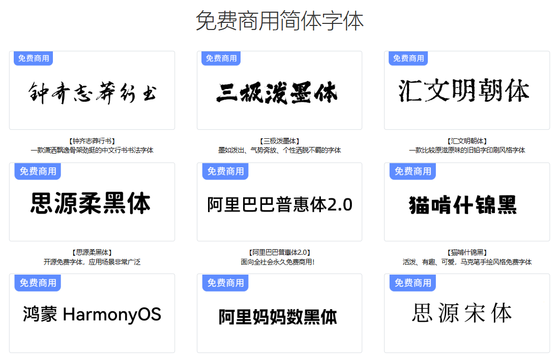 如果你想免费下载字体,那么一定不能错过字由站内的提供的 1000+ 免费字体素材。打开【字由】官网之后,选择 “免费商用” 做为筛选条件,之后就能看到字由提供的支持免费商用的字体素材了。像比较常用的优设好身体,字由文艺黑,思源黑体,阿里妈妈东方楷体等,字由站内均提供了厂商公开授权,商用也不用侵权问题。