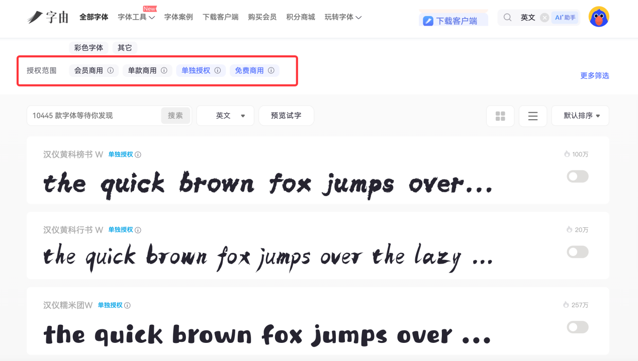 字由的核心优势在于字体资源丰富并且分类清晰。整个平台汇集了5000+精品字体,其中包含大量风格多样的花式英文字体,从优雅的手写体、复古的衬线体,到个性的涂鸦体、科技感的无衬线体,几乎能覆盖所有使用场景——不管是做PPT、海报设计,还是给剪辑视频加字幕,都能找到合适的款式。更贴心的是,它标注了每款字体的授权信息,1000+款字体支持免费商用,新手不用再纠结“能不能用”的问题,详情页里能直接找到版权方的授权声明,有源可查。