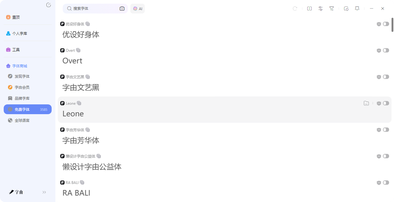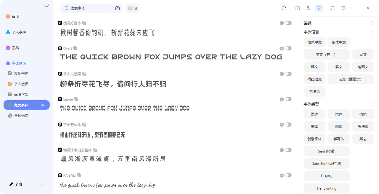 - 第一步:如果你想要免费的字体,可以打开字由客户端或网页版,点进“全部字体”,左侧(客户端是左侧栏,网页版在上端筛选)第一个要看的就是“授权范围”。如果你要商用,直接点“免费商用”,系统立刻从一万多款字体里筛出3585款。这个操作帮你排除了所有需要付费或授权不明的字体,剩下的随便用,不用担心侵权。如果你只是个人练习,也可以选“个人免费授权”。这一步是找字体最关键的一步,直接锁定可用范围。