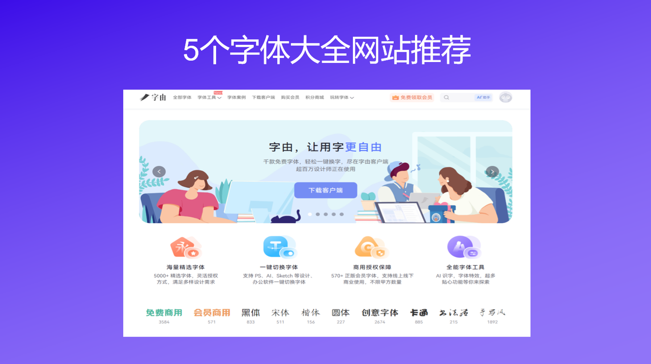 这就是今天介绍的 5 个字体大全网站了,说到底找字体这件事最终还是为了让设计更加出彩,而不是把时间浪费在翻找文件夹、查找版权和装字体安装包这些小事上。这 5 个网站各有各的长处,并且也算作字体大全网站,但是如果想找一个真正能把“找字”和“用字”都安排明白的网站,我还是会选择字由。5000 多款字体只需要打开网站就能够拥有,相当于一个字体大全库,不用下载安装就能用,个人云字库还能让字体跟着账号走,换设备也不用担心。如果感兴趣的话我把字由官网的链接放在这里,点击就可以来使用了!
