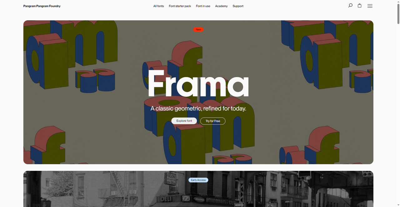 Pangram Pangram 是一家总部位于加拿大的独立字体代工厂,它的定位很清晰:做现代、几何风格的高品质字体,同时保持价格也不算很贵。 Frama 的主推审美取向在于“a classic geometric, refined for today”(经典几何,为当下而 refinement)。字体线条干净、结构严谨,带着明显的包豪斯和瑞士设计的影响,但又不会过于冷淡,适合品牌设计、网页标题、海报等需要“现代感”的场景。并且网站内都会提供字体免费试用,通常是有限字数或者是精简字符。除此之外,网站设有 Academy 板块,里面有字体使用教程、设计案例分享,甚至还有一些免费资源。相当于在卖字体的同时,也在做字体教育。