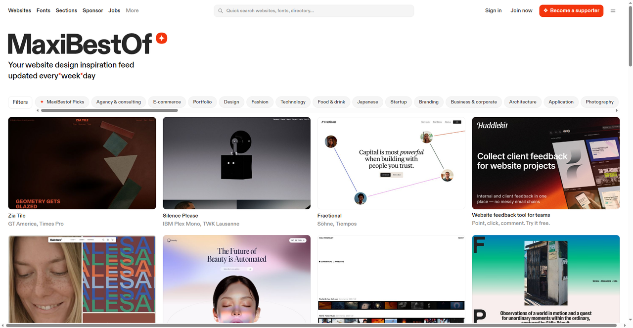 Maxi Best Of 本身不是一个字体下载网站,而是一个网站设计灵感平台——每天更新精选的优质网站案例。但它有一个对设计师特别实用的功能:每个案例下方都会标注该网站使用的字体。你可以看到那些设计奖级别的网站实际用了什么字体,然后去搜索下载或购买。这相当于一个“字体应用实景库”——字体不再是孤立的预览图,而是呈现在真实的设计场景里,你能直观感受到它在排版、配色、布局中的效果。其实也算是另一种意义上的字体大全了!如果不觉得麻烦的话可以先来这里看看有没有喜欢的,再去寻找字体所在的下载链接。需要提醒的是, 这里标注的字体不全是免费的,有些是付费商业字体。但知道了名字,你可以去搜免费替代品,再看是否值得购买。就算不购买,也可以把它当做一个审美学习网站,不论如何都是十分合适的字体网站!