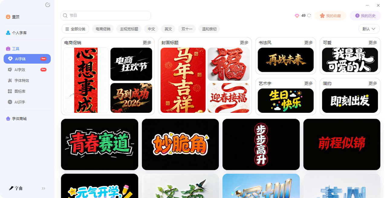 步骤十分简单,哪怕你是0 基础的新手,也能够完全使用。而且字由的AI字体模板库非常丰富,按场景分好了类:电商促销、主视觉标题、节日、国潮、科技、手写……每个分类下都有几十种风格。如果你有自己常用的字体,也可以先用字由的字体库选好基础字体,再用“AI字效”功能给它加特效,同样是一键搞定。