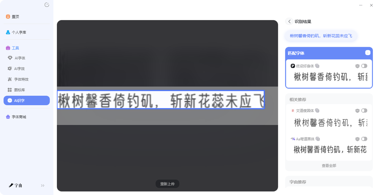 具体的操作步骤如下:在字由里找到【AI识字】,把图片拖进去,几秒钟就出结果。中文字体它认得特别准,什么“演示悠然小楷”“字由文艺黑”,基本不会认错。