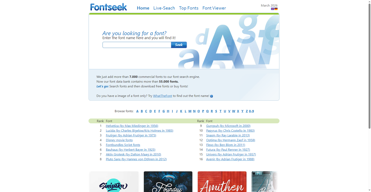 这个网站叫Fontseek,是一个老牌的求字网。它不像别的工具那样靠上传图片识别,而是让你直接输入字体名字来搜索。首页有一个大大的搜索框,输入你听说的字体名,比如“Helvetica”,就能找到相关信息。它家收录了超过55,000款字体,其中还有7,000多款商业字体。下面还有一个热门字体排名,从第1到第16。排第一的是Helvetica,然后是Lucida、Frutiger、Disney movie fonts等等。这个排名挺有意思,能看出大家都在用什么字体。如果你不知道字体名字,只看到一张图片,它也会推荐你去WhatTheFont(就是下面要介绍的网站)来识别。相当于它是一个“文字搜索”入口,配合其他识别工具一起用。我平时知道字体名字但记不清细节的时候,就来这里搜一下,看看预览和介绍,再决定要不要下载。