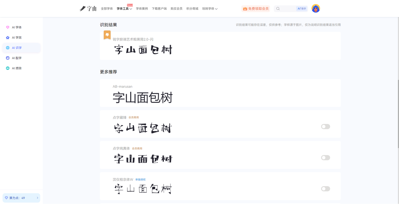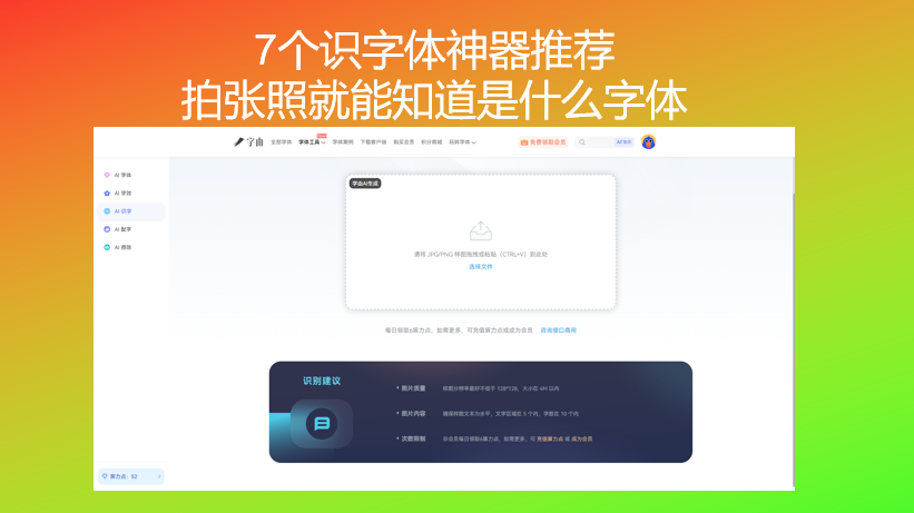 第一个要推荐的识字体工具是字由的“AI识字”功能。和其他工具不同,字由的识别对中文字体特别友好。你看到一张海报上的字很喜欢,截图上传,AI会自动识别字体名称。