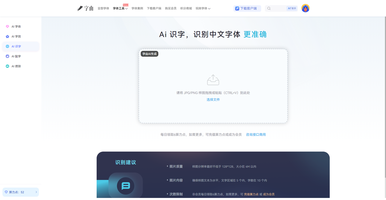具体用法:打开字由客户端或网页版,在导航栏找到【字体工具】→【AI识字】,上传图片,等几秒就能看到结果。支持中文、英文、日文、韩文等多种语言,识别准确率在同类工具里算高的。尤其是识别中文字体,准确率更高。