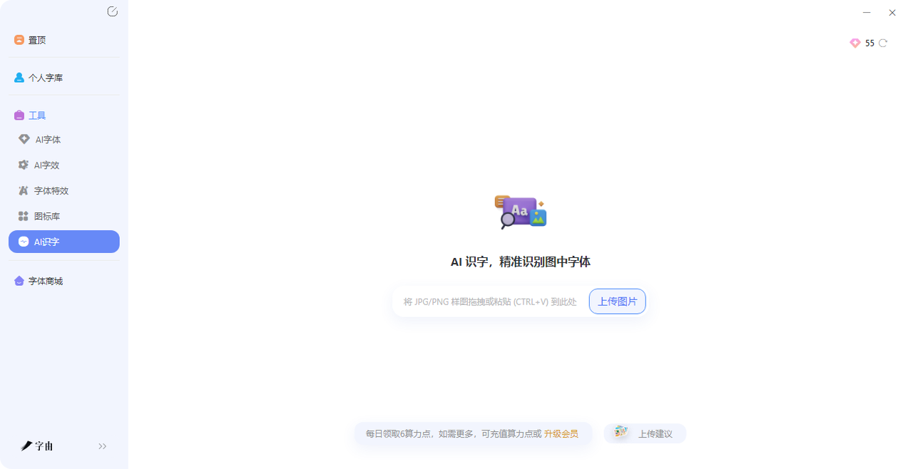 打开字由客户端或网页版,在导航栏找到【字体工具】→【AI识字】。上传带文字的图片,等几秒就能看到结果。它支持中文、英文、日文、韩文,对中文字体的识别准确率特别高。比如你拍一张国风海报,它能认出是“演示悠然小楷”还是“字由文艺黑”。如果图片里的字体是字由收录的,旁边会显示“使用”按钮,点一下就能在PS或AI里直接用。省去再去搜字体、下载、安装的麻烦。