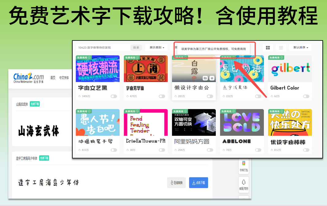 怎样免费下载漂亮的艺术字的艺术字体?怎样下载到支持免费商用的艺术字体?可以来看本文为你整理的艺术字下载攻略。本文将为你详细介绍有哪些好用的艺术字下载网站,比如国内的【字由】,它站内就有上千款漂亮的艺术字支持免费下载,而且均有正版第三方厂商授权,支持商用,用字无需担心侵权。除了好用的字体网站之外,本文还会为你讲解如何使用这些字体网站内提供的艺术字,一起往下看吧!