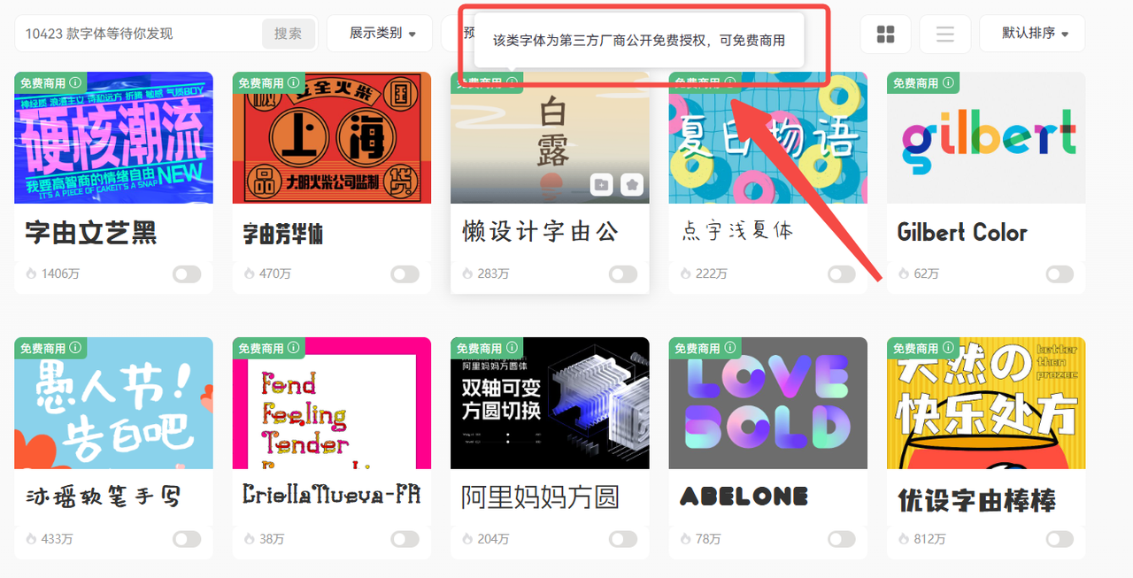 字由是一个专业为设计师提供字体使用的网站,它站内字体素材丰富,除了像思源黑体,优设标题黑这种设计常用字体之外,当然也提供了可免费使用的艺术字,这一点在打开字由之后,按照 “字体类型” 就可以快速筛选查找。字由提供的艺术字体主要有书法体,手写体,创意字,除此之外,还有一些彩色字体可以使用。像中华薪火体,站酷酷黑,阿里妈妈数黑等,字由站内均有提供,且拥有正版第三方厂商授权,用字无需担心侵权问题。