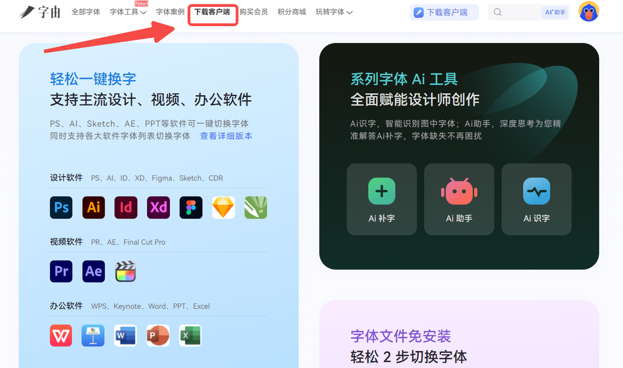如何用更简单的方式下载漂亮的艺术字体呢?首先,我们可以在访问字由官网之后,在官网中安装【字由客户端】。接着【字由客户端】安装成功后,我们只需要把想使用的艺术字体激活,就可以立即应用到设计稿中了,无需再将字体逐个下载到本地。