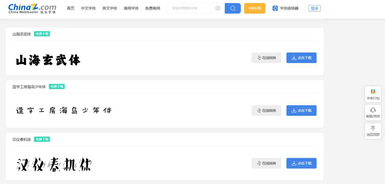 站长字体也是一个十分值得体验的字体网站,不仅是艺术字体,它能提供多种类型的字体素材下载,比如常用的英文字体和中文字体,同样可以来站内搜索查找。