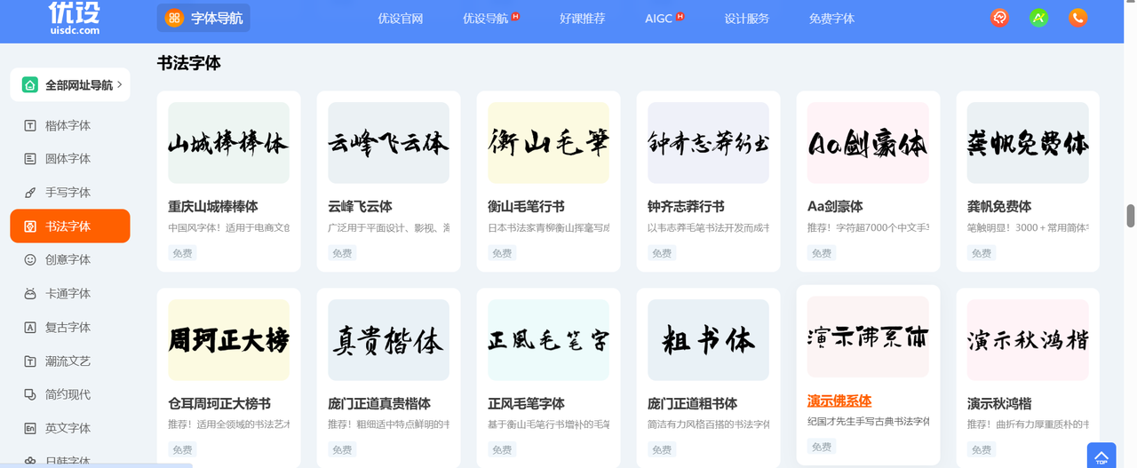 优设字体导航提供的艺术字体主要围绕手写字,艺术字和创意字展开,提供的字体素材虽然不够丰富,但是质量很高,仍然非常值得尝试。