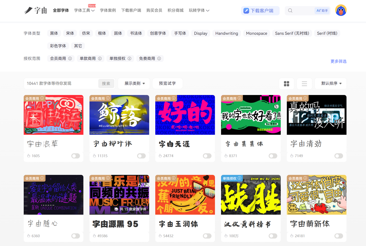 字由是一个拥有海量免费可商用字体资源的字体工具,众多设计师亲测好用。字由提供 5000+ 精选字体,有各种风格的免费书法字体下载服务,例如钟齐志莽行书、汉仪程行简、苍耳周珂正大榜书、汉仪书魂体简以及汉仪孙万民草书等多种热门书法字体都可下载商用,无论是正式场合还是轻松愉快的应用场景都完美匹配,通过不同的书法字体下载应用展现出独特的设计风格,让你的设计别具一格,是一个设计师私藏的免费书法字体下载网站。