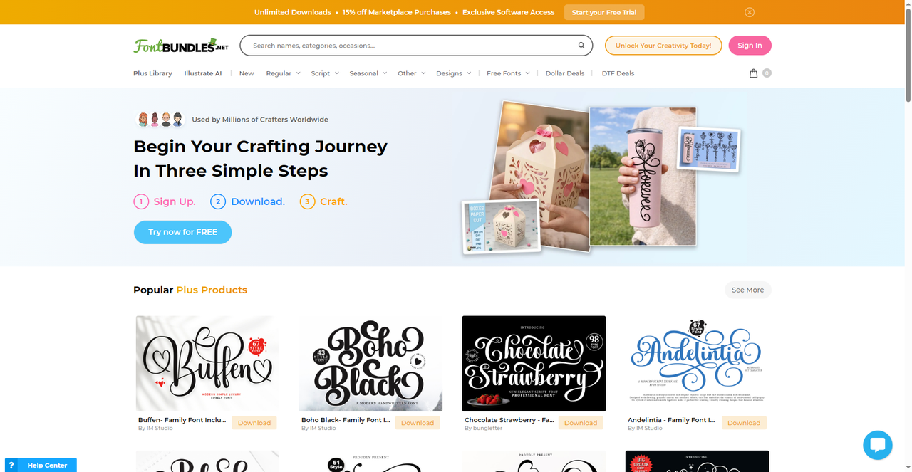 这种简洁的流程对新手特别友好,不需要研究分类,不需要担心授权,注册下载就能用。底部还有“Popular Plus Products”热门推荐板块,方便你快速了解当下流行的字体风格,不用自己慢慢翻。这种“轻量化”的字体平台其实很符合现在的趋势。
