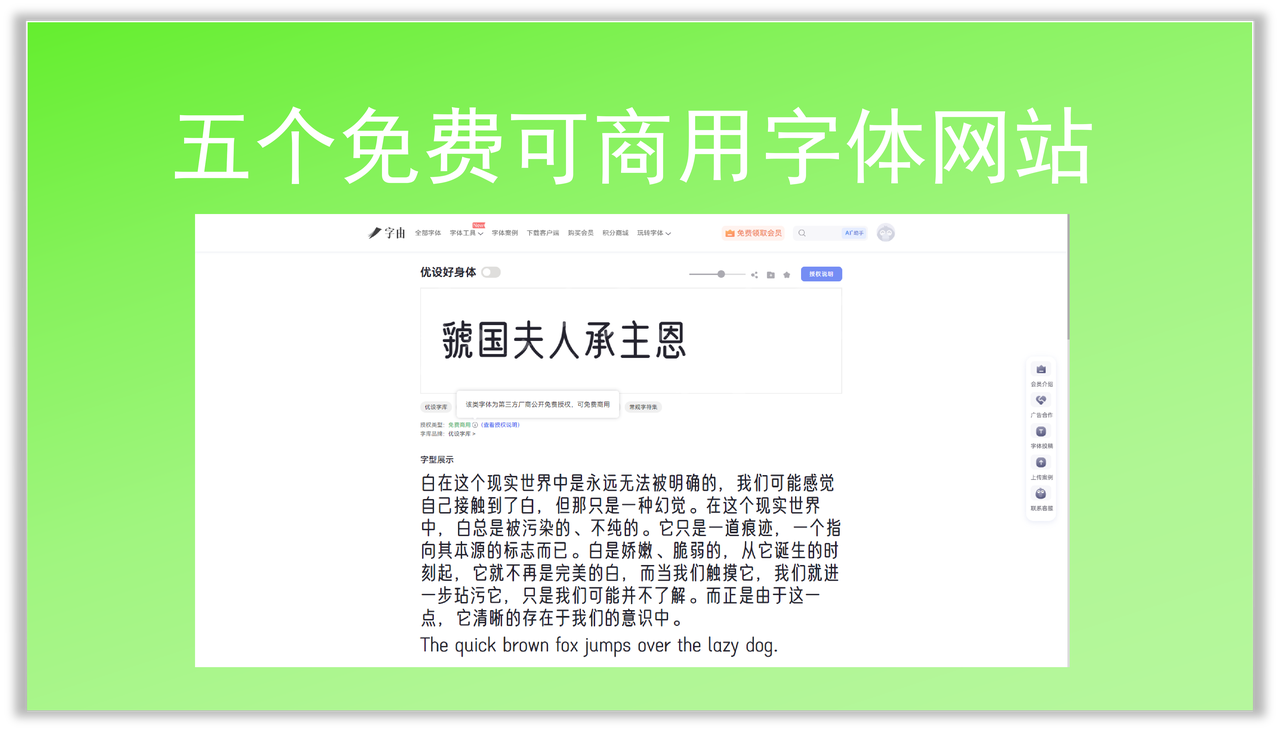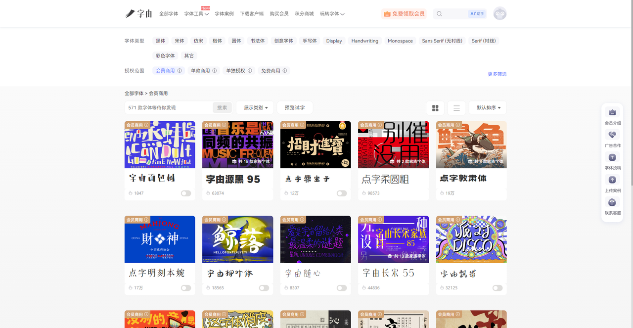 说到免费可商用字体,版权一直都是设计师担心的问题。但是字由提供了 570+ 款正版会员字体,开通会员后可以用于线上线下的商业项目,不限甲方数量。对于接私单的设计师或者小型工作室来说,这个 商用字体授权 服务很实用。不用再担心版权的问题。