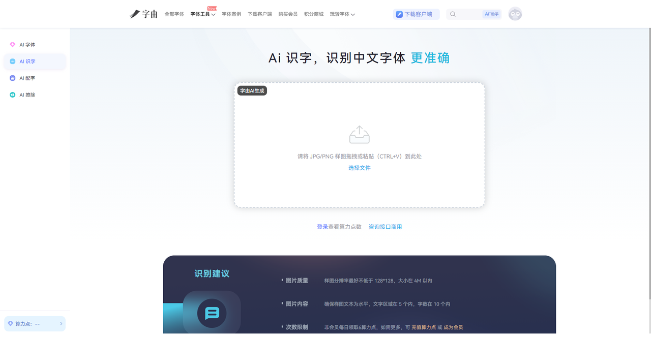 除此之外,字由还有一些其他的小工具方便大家使用,比如说 AI 识字,你上传一张带文字的图片,它能帮你识别出图片里用的是什么字体;还有字体特效,可以快速给文字添加各种艺术效果,做标题海报的时候能省不少时间。