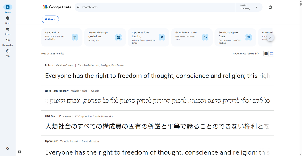 第二款要推荐的是 Google Fonts,这是 Google 推出的开源字体平台,所有字体完全免费,而且可以商用。Google Fonts 上的字体采用开源协议,你可以随便下载使用,做商业项目也没问题。目前平台上有 1400 多款字体,还在不断增加,对于做网页设计或者是要商业接单的设计师来说十分友好,而且在网站里每一款字体都有单独的详情页,展示相关信息,并且还能看到这款字体在全球范围内的使用热度,十分便捷。
