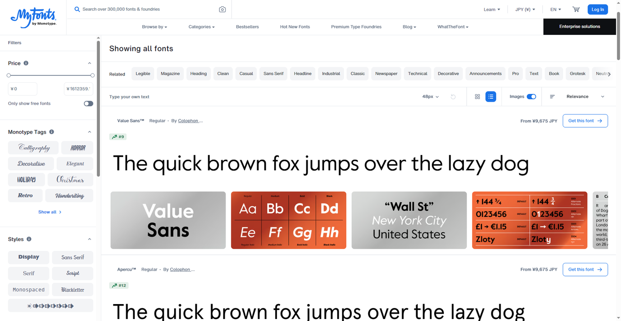 MyFonts 是 Monotype 公司旗下的字体平台,在字体网站中是比较出名的,如果你想找一些小众并且富有设计感的字体,这个字体网站十分适合你。MyFonts 拥有全球最大的字体收藏,汇集了全世界众多字体厂商和设计师的作品,并且时效性很强,一些最新发布的字体也能够在这里找到。除此之外,这个字体网站的分类栏十分实用,你可以按年代、风格、用途这几个标签来找自己想要的字体。最重要的是 MyFonts 支持字体试用功能,如果觉得满意再选择购买。说到这里,需要提醒的是 MyFonts 上的字体大部分需要付费购买,价格从十几美元到几百美元不等。虽然也有免费区,但主力是商业字体。如果你预算有限,可能需要筛选一下。