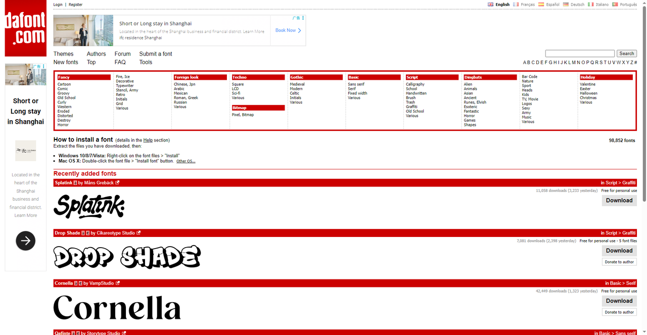 DaFont 是一个非常受海内外欢迎的免费字体下载网站,曾经被很多博主在免费字体网站相关视频里推荐。里面的字体十分丰富,资源来自全球各地的设计师,风格五花八门,经常能找到一些很有个性的手写体、艺术字和装饰字体。需要提醒的是,如果你想下载商用字体,需要仔细查看下载按钮旁边的标注授权类型,比如 Free for personal use(仅限个人免费使用)、Donationware(建议捐赠)、Public domain(公共版权),从而确认是否有商用授权。