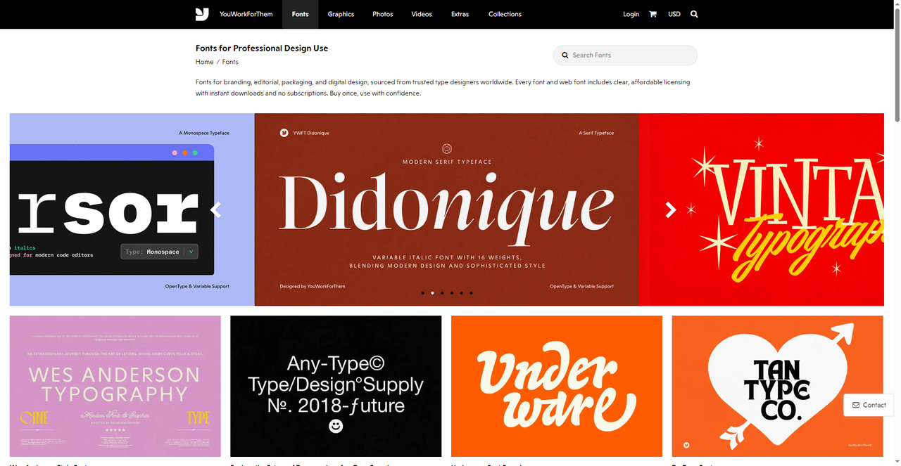 最后一个字体网站是 YouWorkForThem , 它的字体版块汇集了全球众多独立字体工作室和设计师的作品,并且定位很清晰:为专业设计项目提供高品质字体。它的专业体现在来源专业,合作的字体工作室包括 Underware、That That Type Foundry、TanType 等,风格覆盖经典、复古、现代、手写等各种方向,整体质量比较稳定。并且支持买断制授权,采用一次性付费购买的方式,没有订阅制,用起来非常放心。并且网站会整理热门字体合集,比如“ Clarendon 字体替代推荐”、“ Swiss 风格字体”等,方便你按风格寻找灵感。如果你正在做品牌设计、画册排版、包装设计这类对字体质感要求较高的项目,想找一些有特色、不那么大众化的专业字体,可以关注一下这个字体网站。