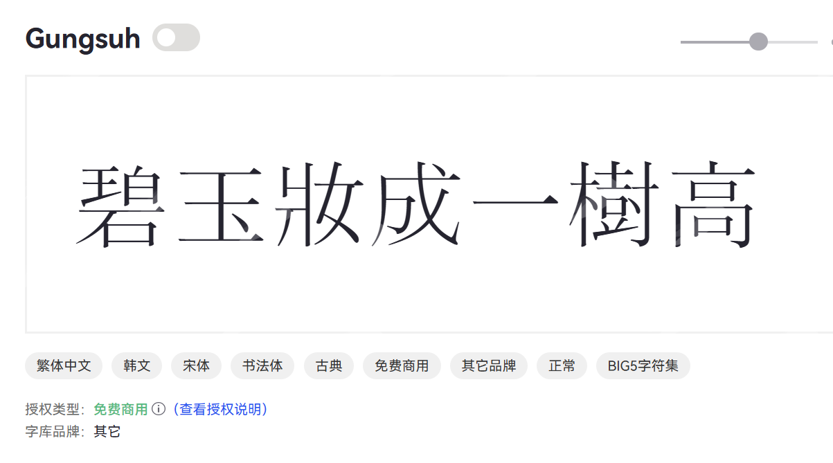 Gungsuh 是比较经典的韩文衬线字体,灵感来源于传统书法,笔画圆润柔和。Gungsuh 适合正式文档和文化类出版物,字形平衡,阅读舒适,传递出沉稳与传统的美感。