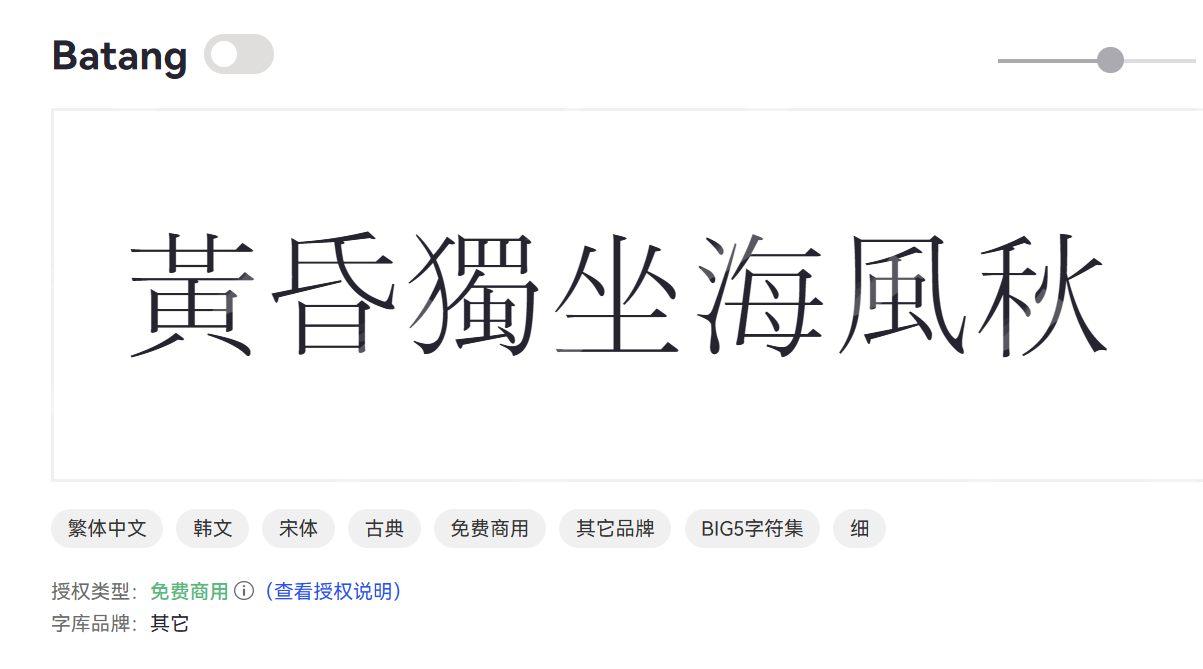 Batang 同样也是一款传统的韩文衬线字体,笔画细致流畅。Batang常用于书籍、报纸及正式文件排版,细节丰富,具备优良的长文本阅读体验,且兼容性强。