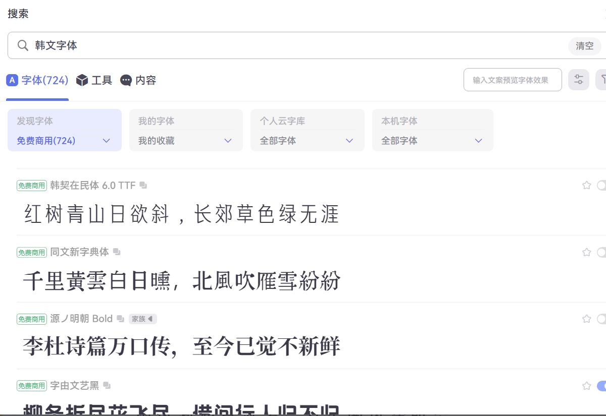 打开字由客户端,搜索韩文字体